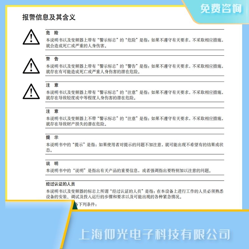 本說明書以及變頻器的標志上所謂“經過認證的人員”是指:在本設備上進行工作的人員必須熟悉